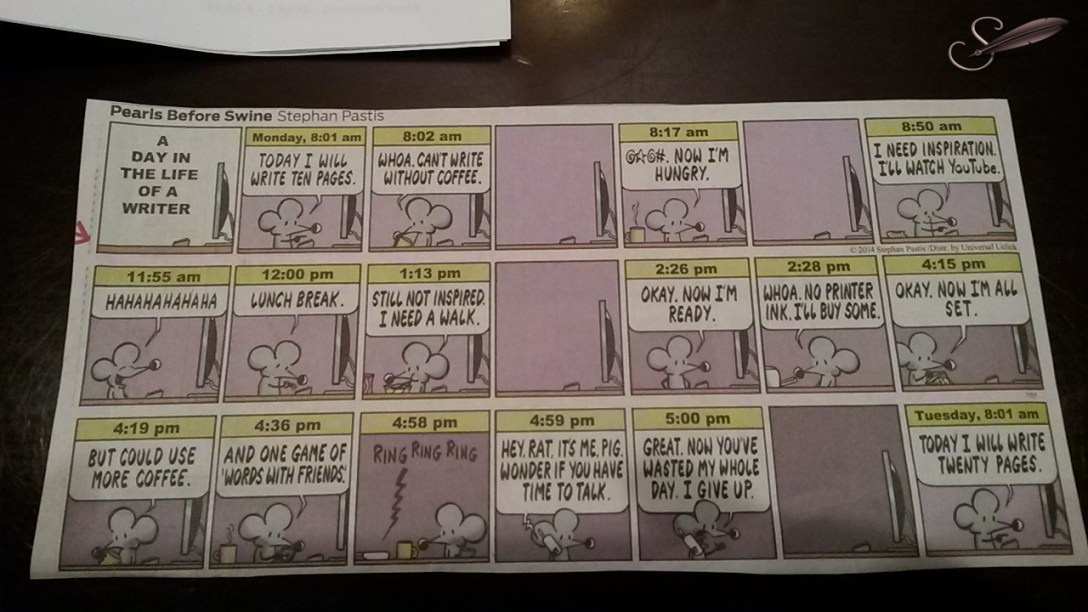 [humor][cartoony] A day in the life of a writer. August 27, 2014 dynasticqueenLeave a comment My long-time writing friend and fiction focus group critique-mate Jennie brought this comic strip to our monthly meeting last night. It cracked us up. Every writer alive (or dead) knows that there are times when it's doggone true. LOL